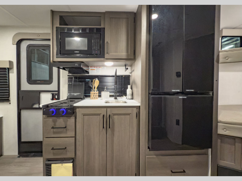 Sleeps 7 Slides 1 Length 23 ft Ext Width 8 ft Ext Height 10 ft 6 in Int Height 6 ft 6 in Hitch Weight 524 lbs GVWR 5500 lbs Dry Weight 4784 lbs Fresh Water Capacity 37 gals Grey Water Capacity 74 gals Black Water Capacity 37 gals Tire Size ST225/75R15LRE Furnace BTU 20000 btu Number Of Bunks 2 Available Beds Queen Murphy Bed Refrigerator Type Glass Front 12V Refrigerator Size 10 cu ft Cooktop Burners 2 Shower Size 27" x 36" Number of Awnings 1 LP Tank Capacity 20 lbs Water Heater Capacity 6 gal Water Heater Type Gas/Electric AC BTU 13500 btu Awning Info 16' Power w/Fusion Light Axle Count 1 Number of LP Tanks 1 Shower Type Walk-In Shower Similar Floorplans
